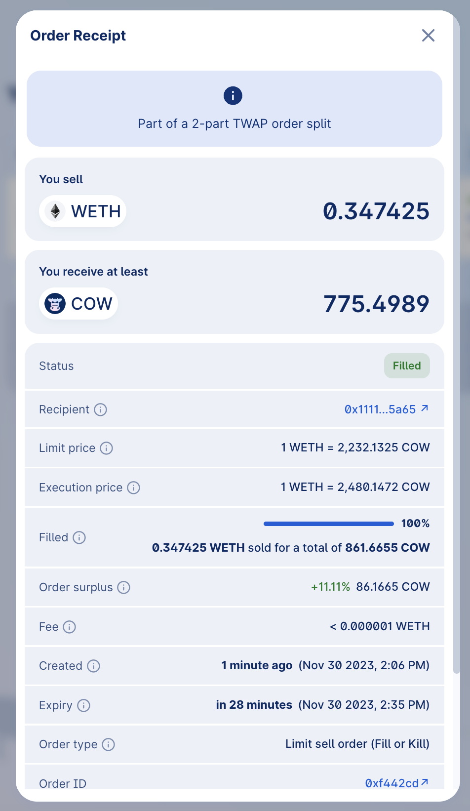 Finally, the "Order receipt" provides a detailed confirmation of your active TWAP order, complete with execution details and transaction details.