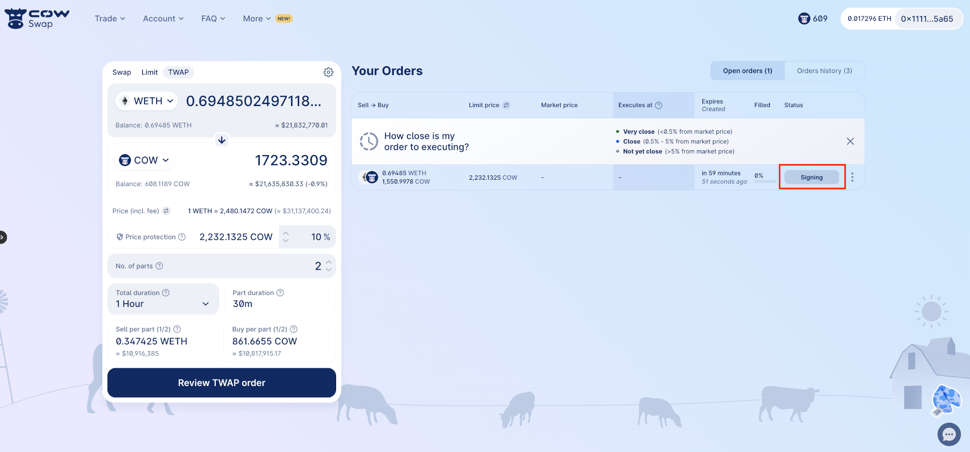Once you've signed the order, the process of finalizing and monitoring your TWAP order begins. This is a multi-step process that ensures your order is securely processed and activated.