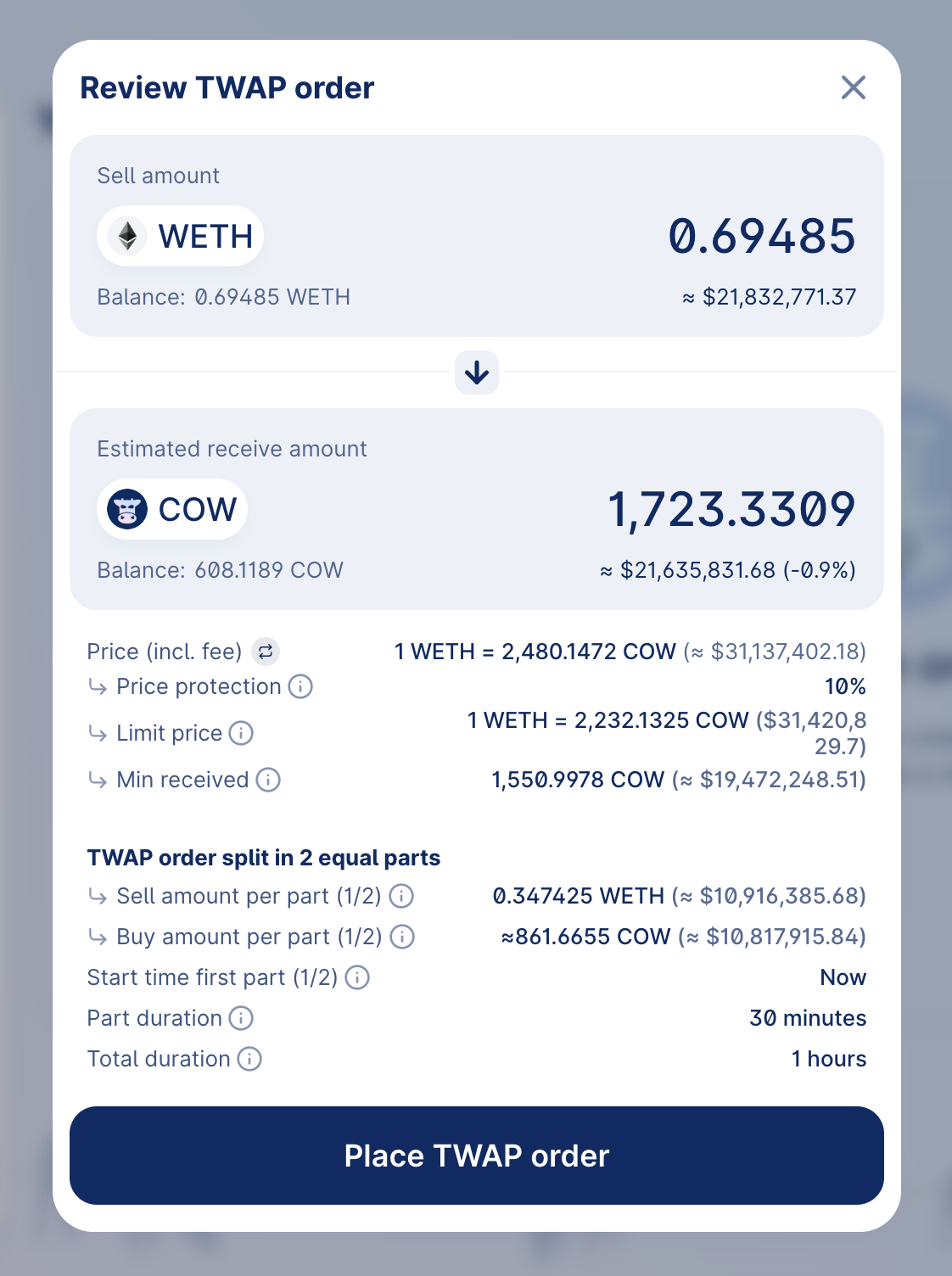 TWAP orders are a strategic approach for large trades, reducing price impact and securing better average prices. Try it out and let us know your experience at info@cow.fi!